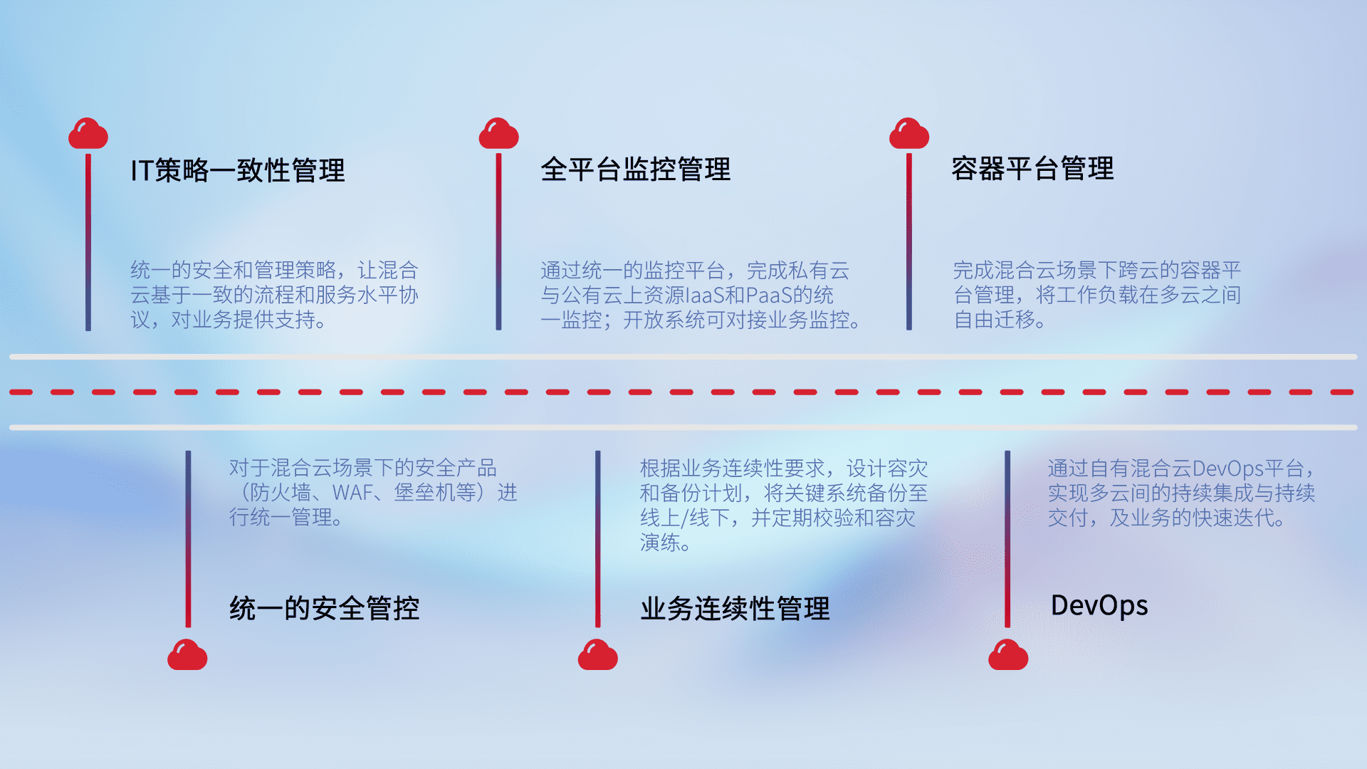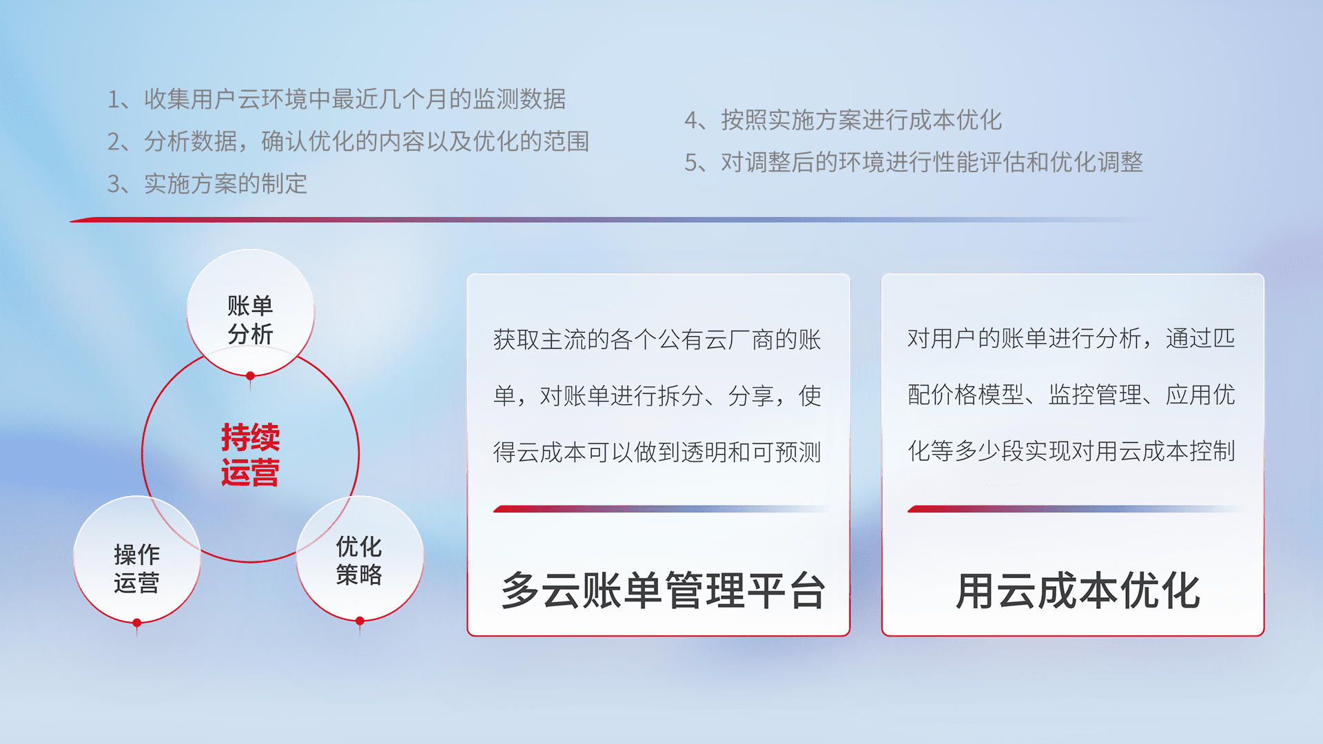 通过多云纳管,,,以统一的资源数据模型把客户的云资源进行抽象和封装,,,,进而实现对多云资源的统一操作,,保障云资源管理的可靠性、、、、稳定性与可用性。。量身定制化运维内容,,配置、、开发运维、、、、补丁管理、、备份、、、、监控、、、认证和访问管理、、、审计和日常巡检等,,,保障在用云过程中的可靠度,,,稳定度以及高可用率。。。。