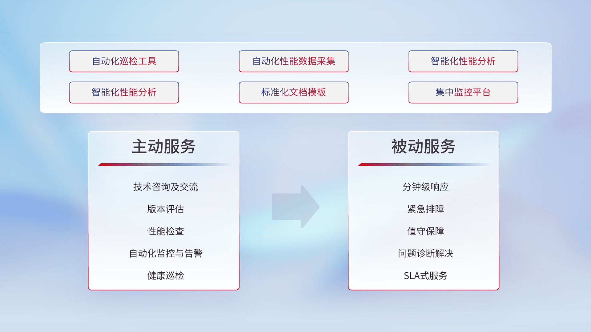 智能化工具和标准化文档,,保障服务质量,,提供主动服务(包含技术咨询、、、、版本评估、、、、性能检查、、自动化监控与告警、、健康巡检)和被动服务包含(分钟级响应、、、紧急排障、、、值守保障、、问题诊断解决、、SLA服务)。。。